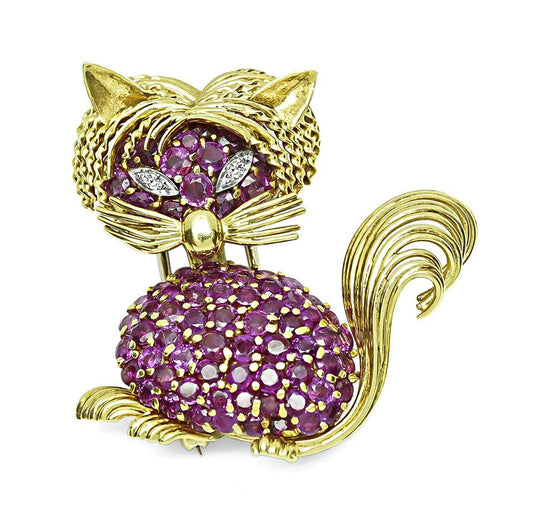 Estate 7.00ct Ruby Diamond Gold Cat Pin
