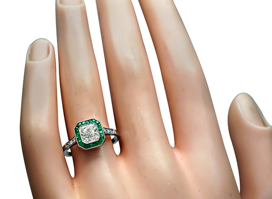 Art Deco 1.06ct Diamond Emerald Halo Engagement Ring