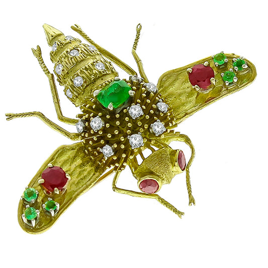 Vintage Multi Color Precious Stone and Diamond 18k Yellow Gold Bee Pin