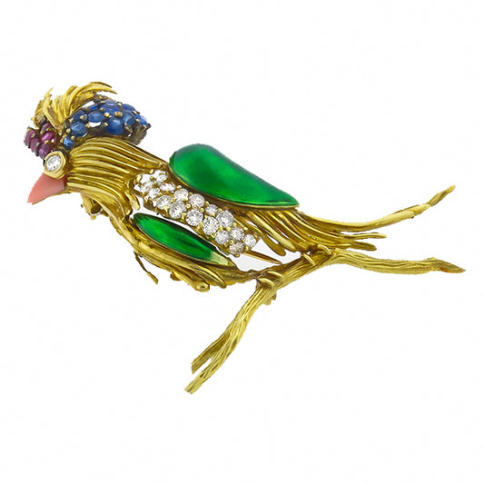 Vintage Multi Precious Stone Coral Enamel Bird Pin