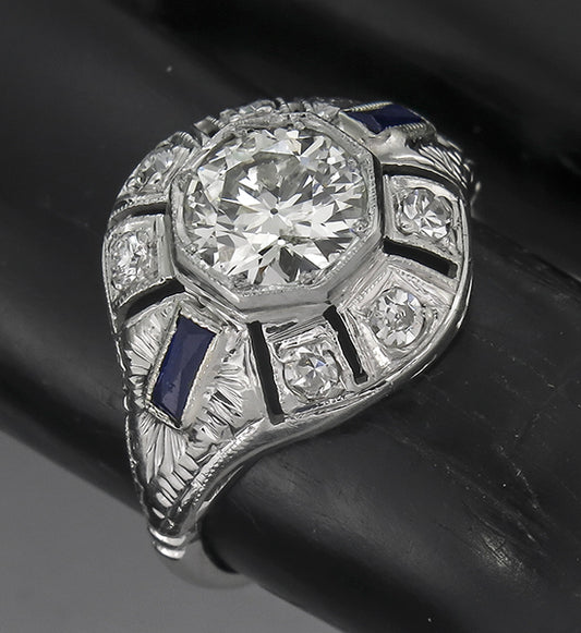 Art Deco 1.37ct Diamond Sapphire Platinum Engagement Ring
