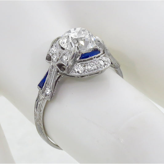 Art Deco 1.15ct Old Mine Diamond Sapphire Platinum Engagement Ring