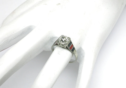 Art Deco 1.16ct Diamond, Onyx & Coral 18k White Gold Engagement Ring