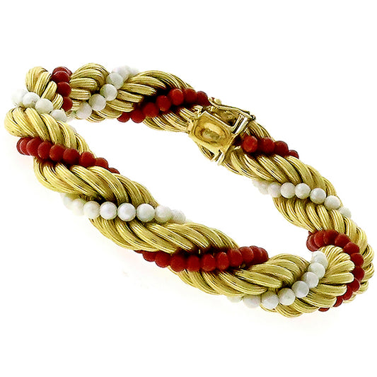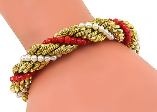 Estate 1960s Pearl And Coral Bead 18k Yellow Gold French Twist Rope Bracelet