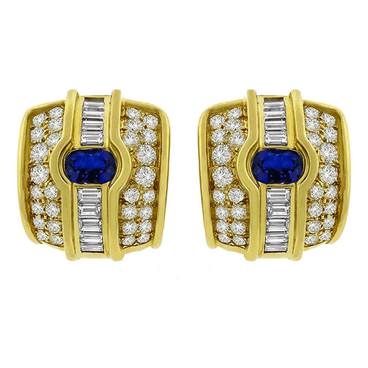 Oval Sapphire and Diamond Baguette Yellow Gold Earrings