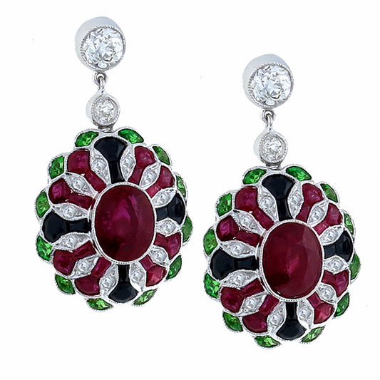 Antique Style 5.17ct Ruby 0.76ct Diamond 1.00ct Tsavorite & Onyx Earrings