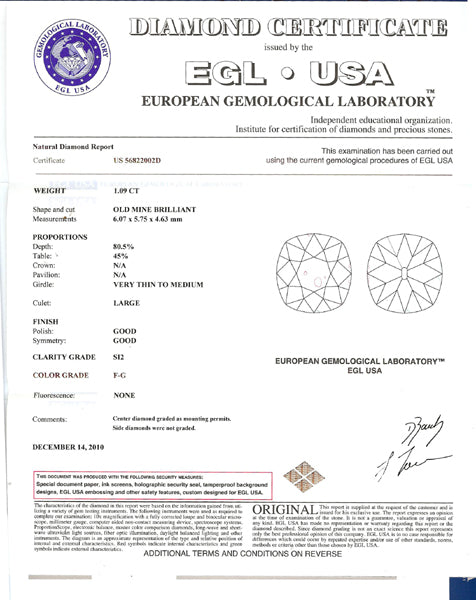Edwardian EGL Certified I-J VS2 1.09ct Diamond Platinum Engagement Ring