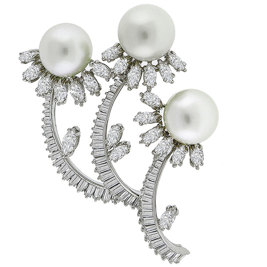Estate 1950s 6.00ct Marquise & Baguette Cut Diamond Pearl Platinum Pin