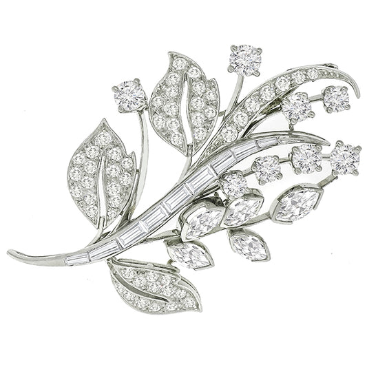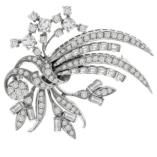 1950s 2.50ct Round Marquise and Baguette Cut Diamond 18k White Gold Floral Pin