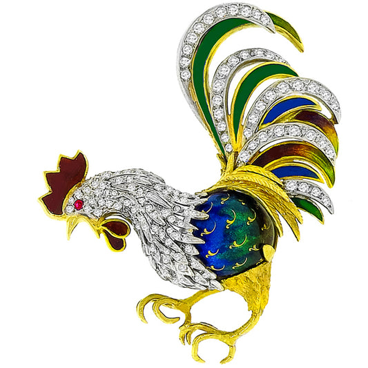 Vintage 1.50ct Diamond Enamel Ruby 14k Two Tone Rooster Pin