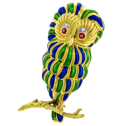 Estate 1960s Round Cut Ruby & Diamond 18k Yellow Gold Enamel Owl Pin