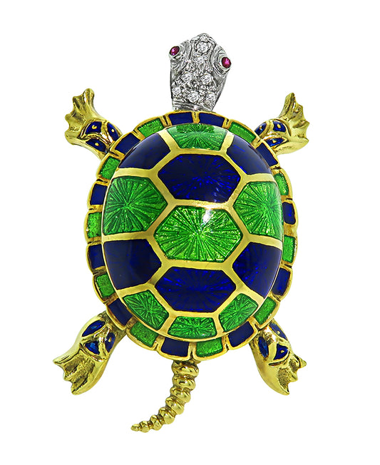Estate Enamel Diamond Gold Turtle Pin
