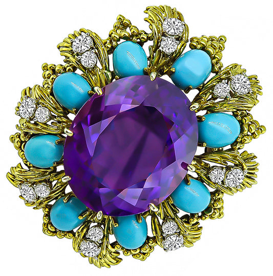 Vintage 35.00ct Amethyst 2.75ct Diamond Turquoise Pin/Pendant