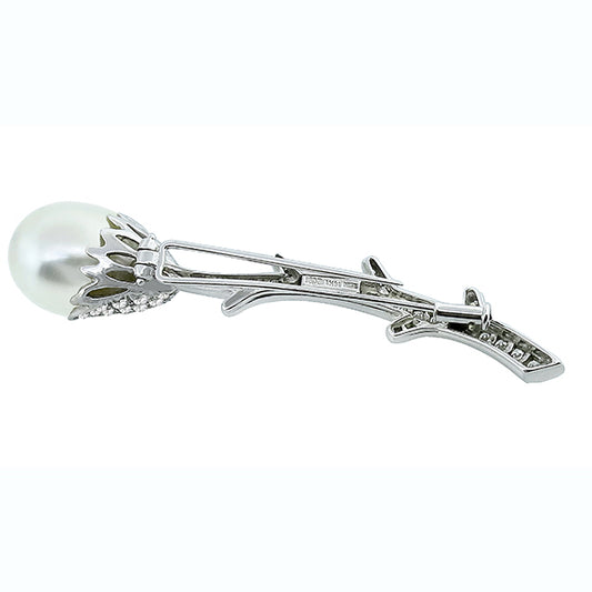 Estate 1.50ct Round Diamond 15.5mm South Sea Pearl 18k White Gold Flower Pin