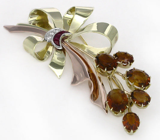 1940s 20.00ct Citrine 0.20ct Ruby 0.10ct Diamond 14k Two Tone Gold Pin