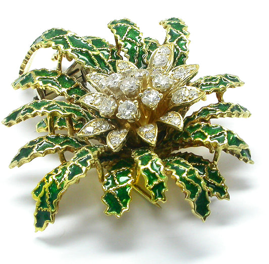 1960's Enamel Diamond 18k Yellow & White Gold Floral Pin